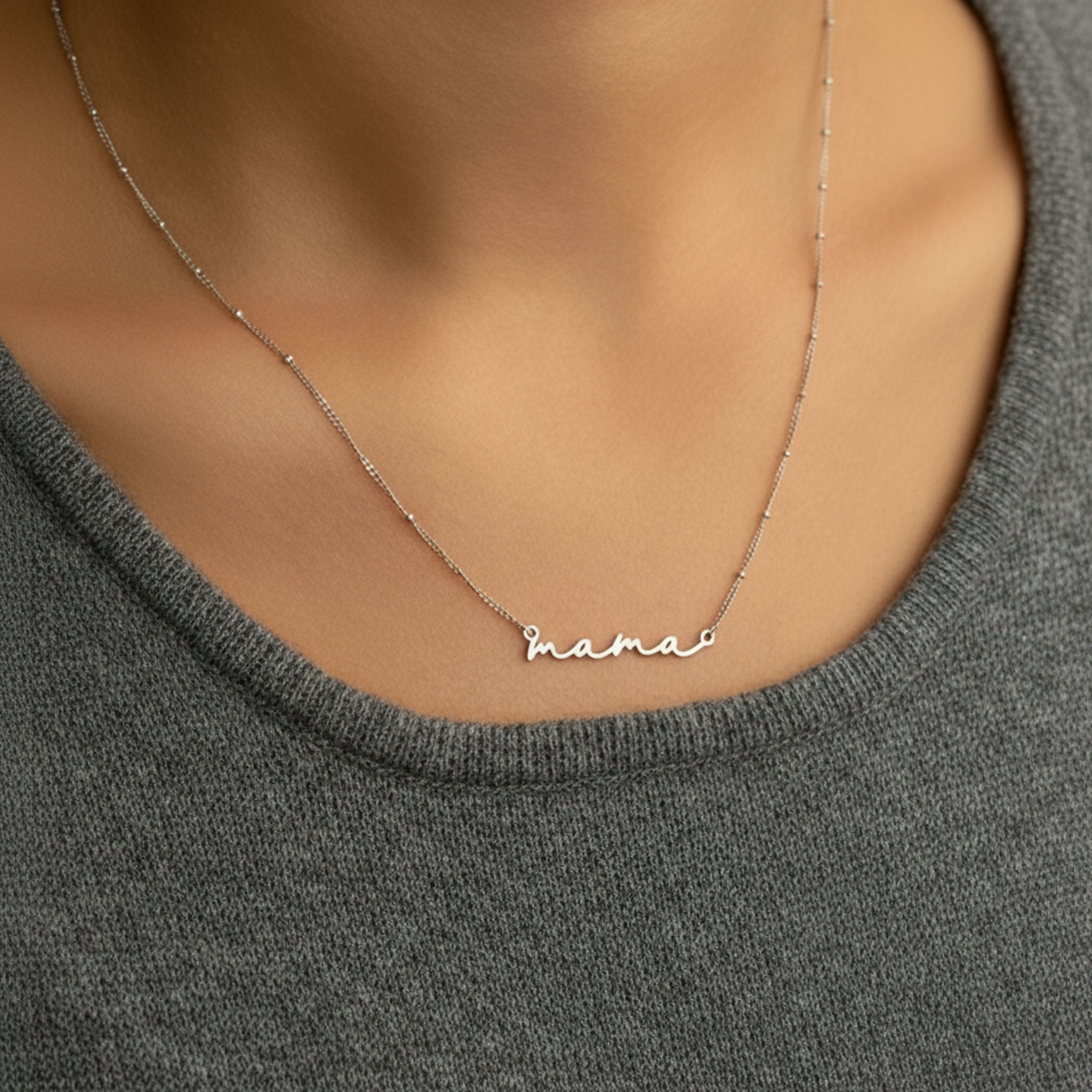 Add a touch of elegance to your everyday look with our stunning "Mama" necklace. Made with high-quality materials, this necklace is both durable and fashionable. The sleek design features the word "Mama" in a beautiful cursive font, making it the perfect accessory for any outfit.