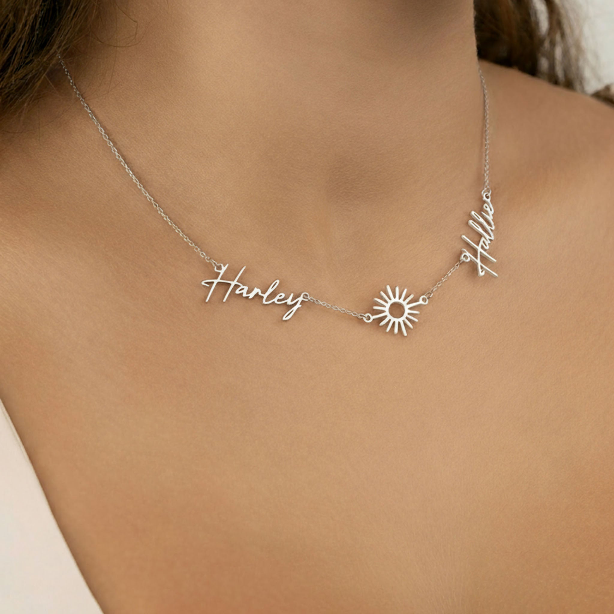 Double Name with Sun Necklace – a radiant personalised piece that celebrates warmth, light and positivity. This elegant design connects two custom names with a beautifully detailed sun charm, symbolising energy, strength and love that shines bright every day.