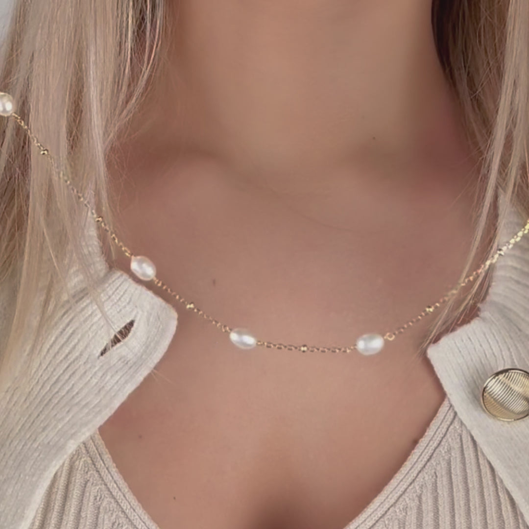 This is the more delicate of our pearl styles, with 4mm white freshwater pearls interspersed with subtle metal spheres along a fine chain. It’s a graceful piece that can be worn on its own or paired with our matching bracelet and earrings for a coordinated look.