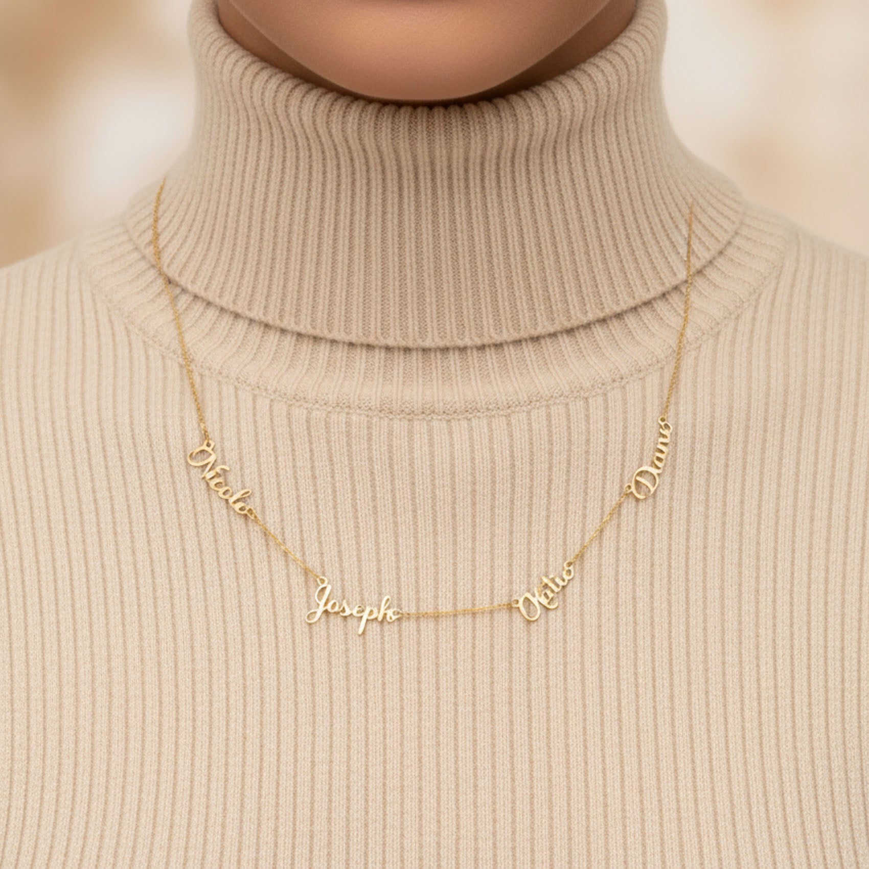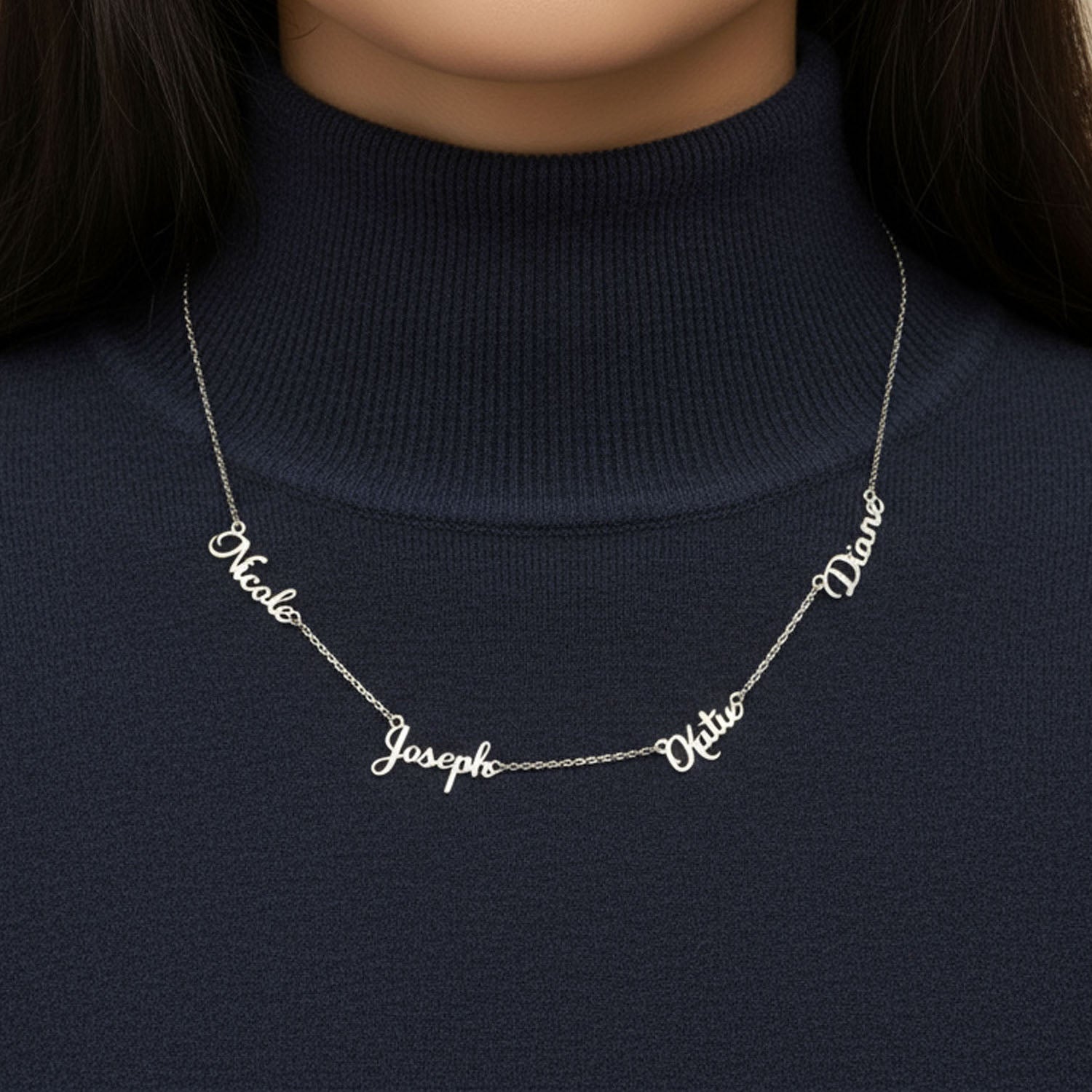 Celebrate your favourite four with this beautifully crafted quadruple name necklace – a meaningful keepsake that keeps your loved ones close, always. Whether it’s your children, siblings, best friends or a mix of names that matter most, this necklace is designed to tell your story with effortless style.