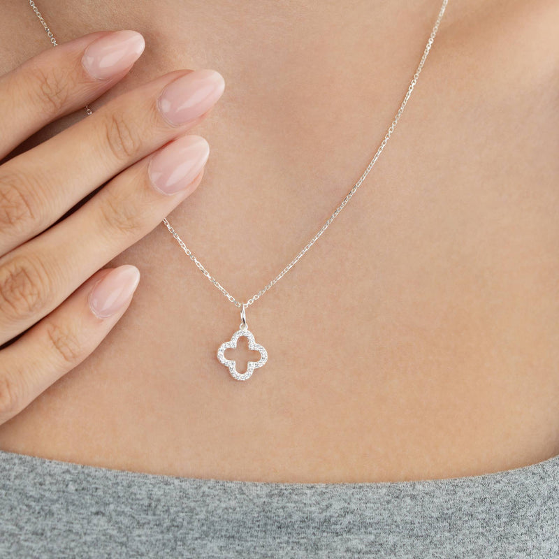 This cubic zirconia open quatrefoil necklace offers a fresh take on a classic clover-inspired shape. The open centre keeps the look light and modern, while the pave-set cubic zirconia border adds a touch of sparkle. Perfect for everyday elegance or layering with other necklaces.