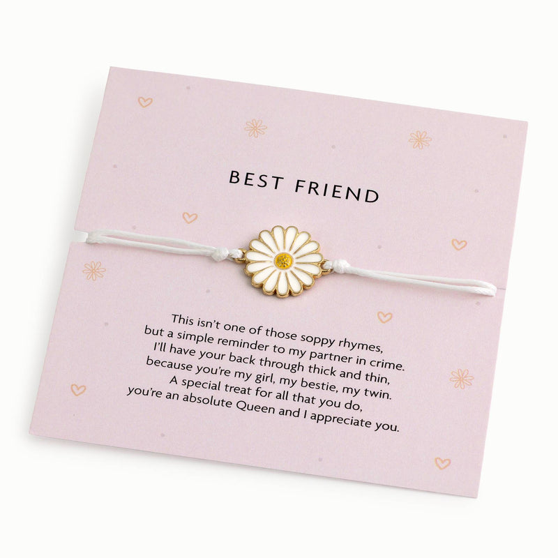 Celebrate the bond you share with your bestie with this sweet daisy charm bracelet. The delicate daisy, with its bright yellow centre, sits on a soft white adjustable cord and comes mounted on a beautifully designed sentiment card. It’s a thoughtful little gift that says “thank you,” “happy birthday,” or simply “I appreciate you” in the loveliest way.
