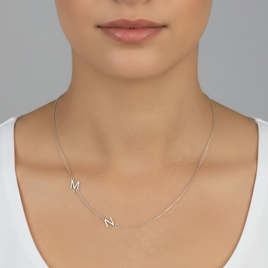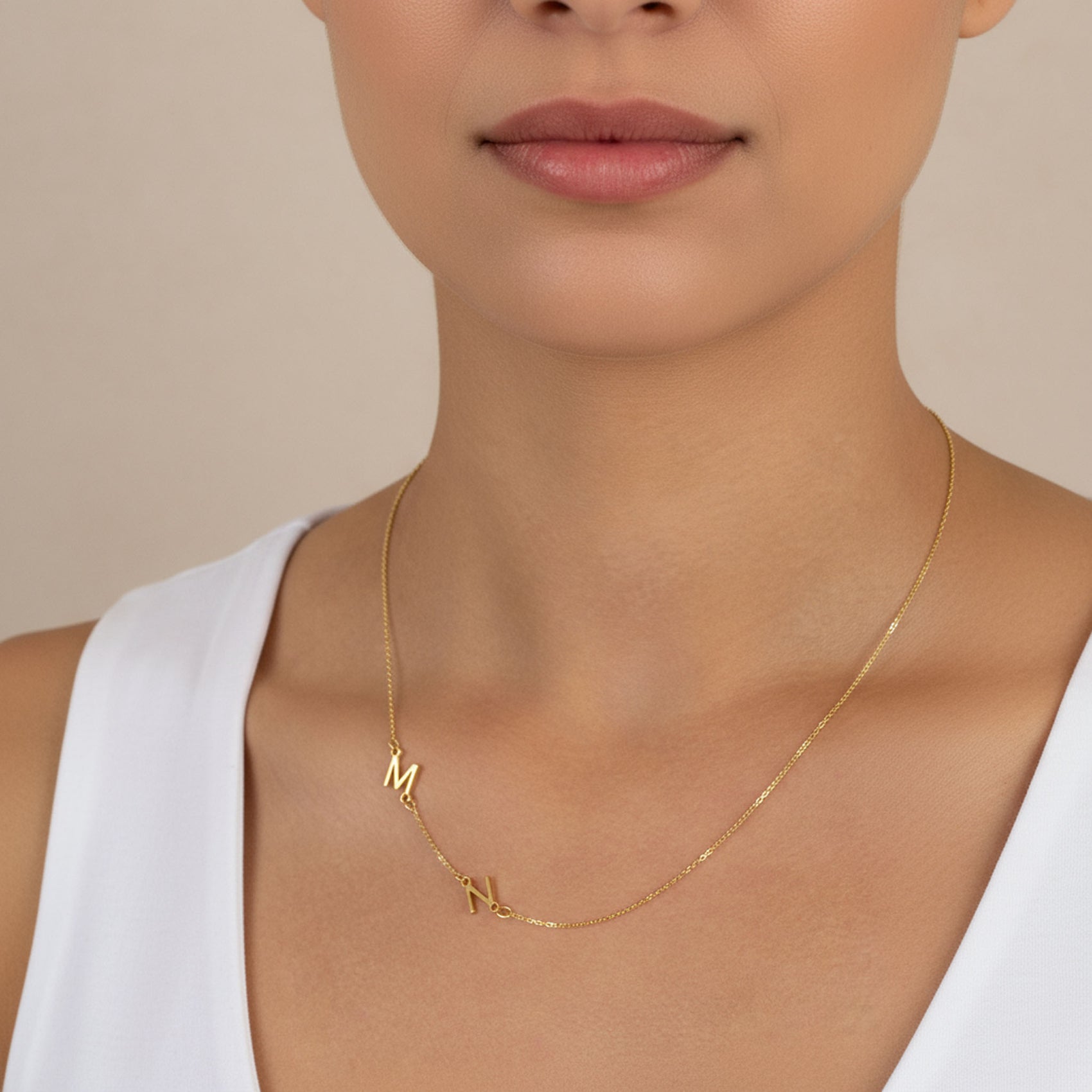 This elegant design features two initials placed sideways on a fine chain, creating a sleek, modern silhouette that’s perfect for layering or everyday wear. Choose the letters that matter most and carry them with you, always.