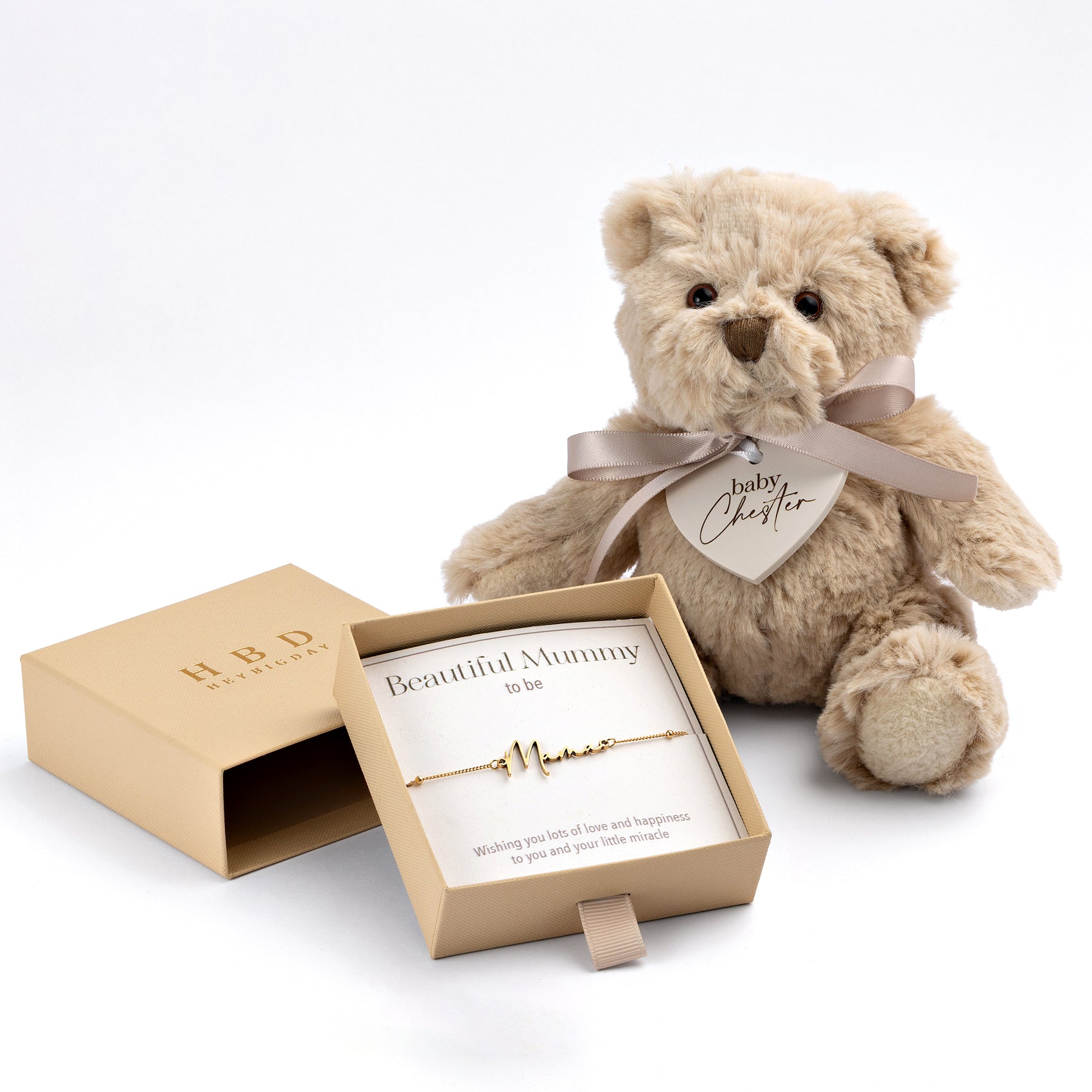 Celebrate the joy of motherhood with the To the Beautiful Mum-to-Be Bracelet Set. This elegant set features a delicate bracelet, symbolising love and new beginnings, paired with an adorable teddy bear for an extra touch of warmth. The set includes a personalised plaque, engraved with a heartfelt message of your choice, making it a truly unique and sentimental keepsake. A perfect gift to cherish this special journey into motherhood.